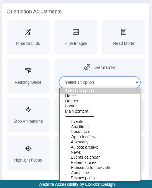Orientation Adjustments: Hide Images, Mute Sounds, Useful Links, ReadMode, Reading Guide, Reading Mask, Highlight Focus, Highlight Hover, Big White Cursor, and Big Black Cursor.
